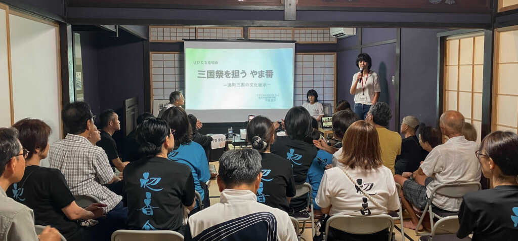 平野俊幸氏からは、三国祭の歴史や「やま番」の変遷についてのお話を。村田ひとみ氏からは、お囃子の魅力や継承の歩みについて熱く語っていただきました。