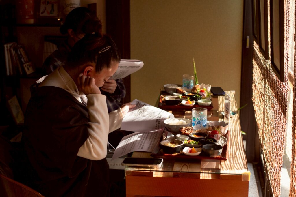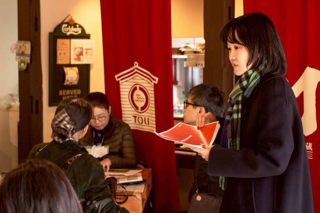 三国提灯の制作工房いとやさん運営する「灯」にてランチをいただきつつ、三国の歴史や町なみの形成背景、空き家を活用する際に利用できる補助金等について、レクチャーを行いました。また、参加者同士の交流も行い、各自が考えている事業について意見交換を行う時間となりました。