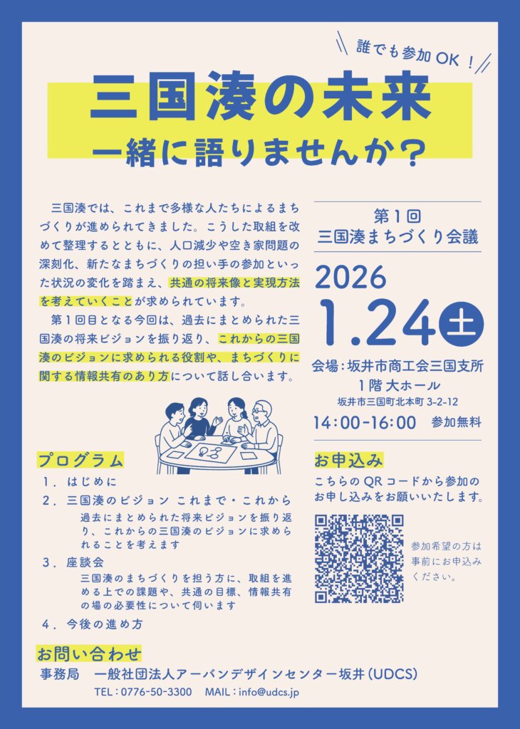三国湊では、これまで多様な人たちによるまちづくりが進められてきました。 こうした取組を改めて整理するとともに、人口減少や空き家問題の深刻化、新たなまちづくりの担い手の参加といった状況の変化を踏まえ、共通の将来像と実現方法を考えていくことが求められています。 第1回目となる今回は、過去にまとめられた三国湊の将来ビジョンを振り返り、これからの三国湊のビジョンに求められる役割や、まちづくりに関する情報共有のあり方について話し合います。
