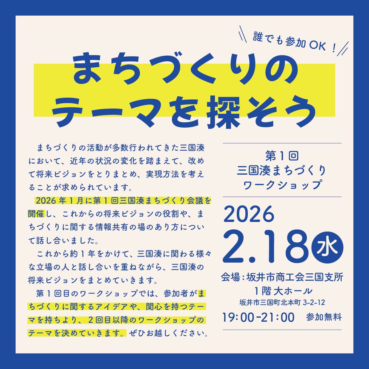 2026年1月に第1回三国湊まちづくり会議を開催し、これからの将来ビジョンの役割や、まちづくりに関する情報共有のあり方について話し合いました。これから約1年をかけて、三国湊に関わる様々な立場の人と話し合いを重ねながら、三国湊の将来ビジョンをまとめていきます。
