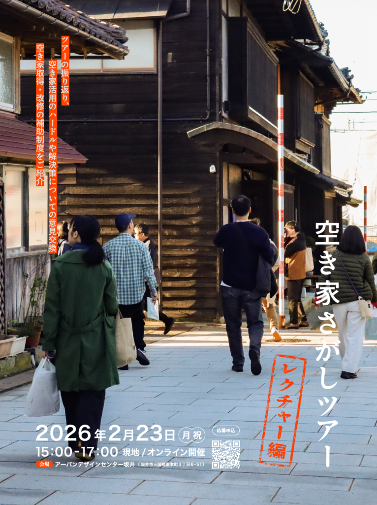 2025年11月、歴史的な町並みが魅力の湊町・三国で空き家や空き店舗を活用してお店を始めたい方に向けた、「空き家さがしツアー」を行いました。今回は前回のツアーに続き、空き家取得・改修の補助制度のご紹介やツアーのふり返りを行います。三国または坂井市内で空き家をお探しの方にぜひ知っていただきたい内容となっています。ぜひお気軽にご参加ください。